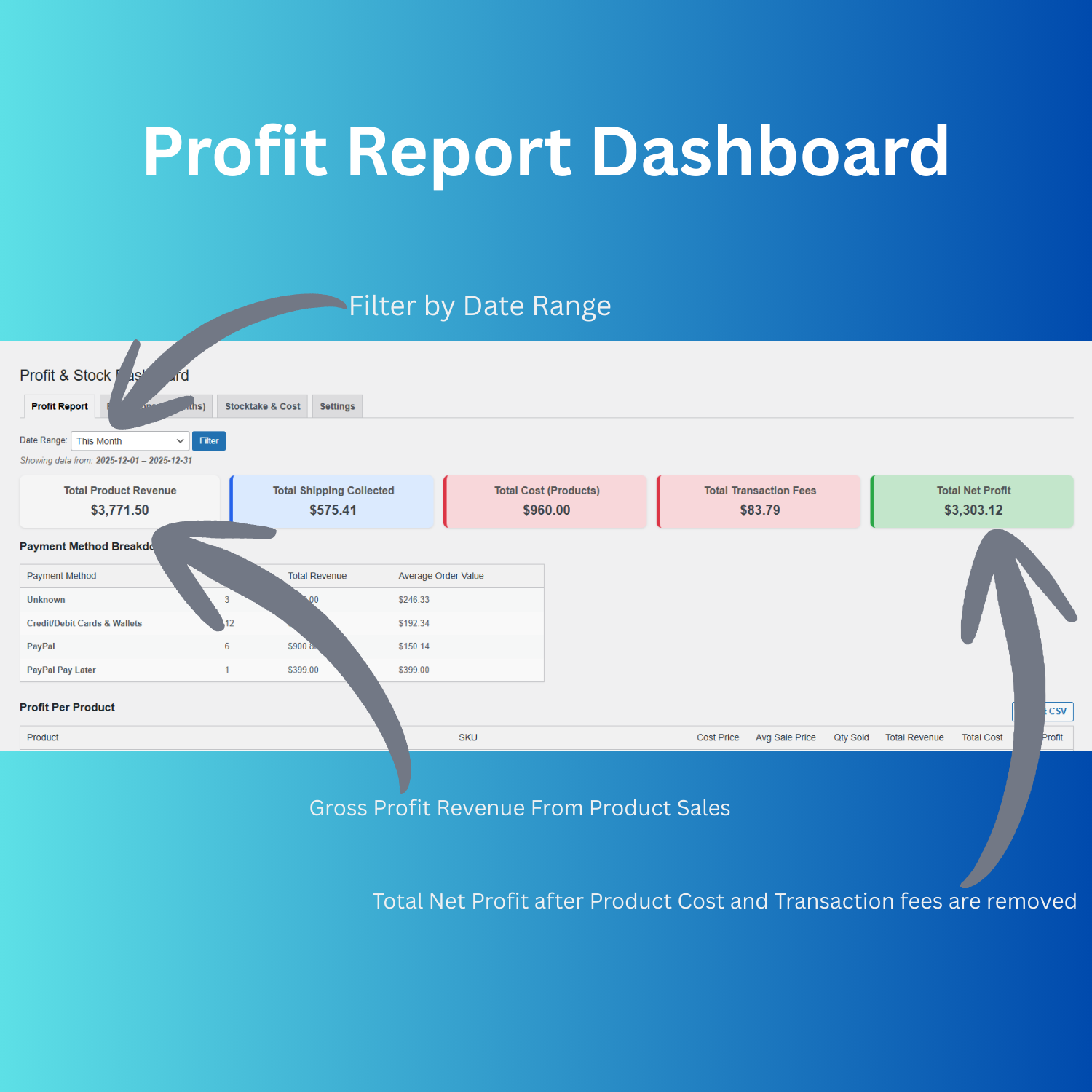 A powerful Profit & Stock Dashboard for WooCommerce, designed to give store owners clear, real‑time insight into store performance and profitability. The dashboard focuses on actionable metrics, making it easy to understand where revenue and profit are coming from at a glance.